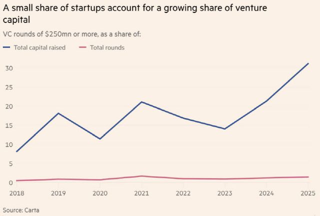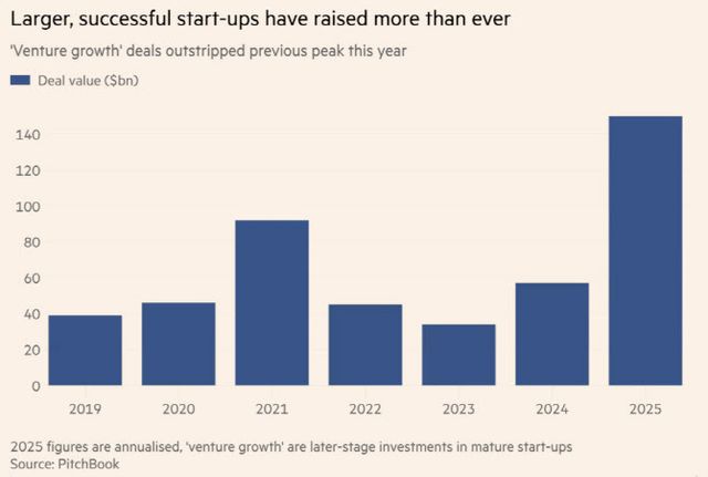 파이낸셜타임스(FT)는 28일(현지시간) 피치북(PitchBook) 자료를 인용해 미국 주요 스타트업들이 2025년 1500억달러(약 215조원)를 조달했다고 보도했다. 2021년 기록한 920억달러를 63% 웃도는 역대 최고치다.