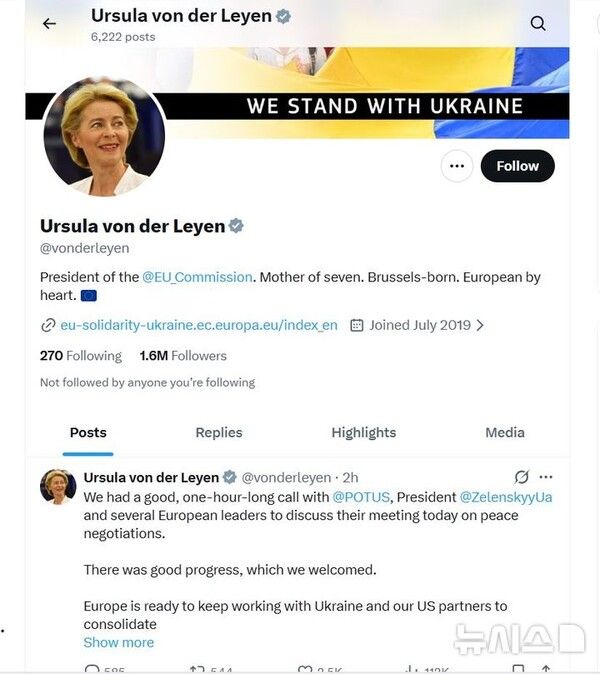 뉴시스 보도에 따르면, 폰데어라이엔 집행위원장은 이날 사회관계망서비스 엑스(X)에 "우리는 트럼프 대통령과 젤렌스키 대통령, 그리고 여러 유럽 정상들과 한시간 동안 전화 통화를 하며 오늘 평화 협상 회담에 대해 논의했다"며 "좋은 진전이 있었고 우리는 환영했다"고 적었다.