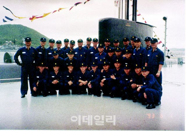 | 1993년 6월 1일 진해군항에서 인수 승조원들이 장보고함 취역 기념촬영을 하고 있다. (사진=해군) |