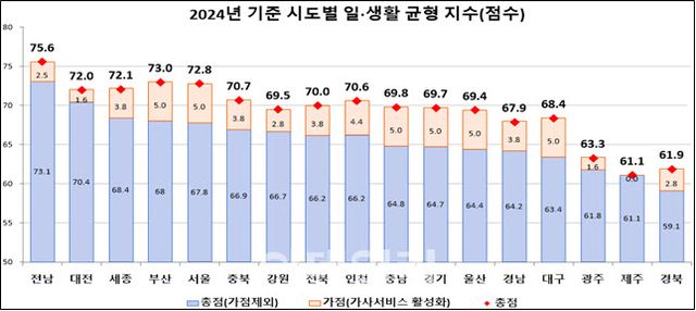 전국 평균 지수는 65.7점(가점 제외)으로 1년 전보다 4.9점 올랐다. 17개 시·도 중 16개 지역의 지수가 전년 대비 상승하는 모습을 보이면서 전국적으로 일·생활 균형이 꾸준히 개선되는 흐름을 보였다. 남성 육아휴직 사용 사업장 비율, 국공립 보육시설 설치율이 증가한 영향으로 풀이된다.