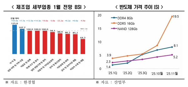 한경협은 건설과 철강 업황 악화로 관련 업종(비금속 소재 및 제품, 금속 및 금속 가공) 부진이 장기화되고, 최근 반도체 가격 상승에 따른 전자‧통신장비의 일시적 수요 둔화가 예상되면서 전반적인 제조업 심리가 위축되고 있다고 풀이했다.