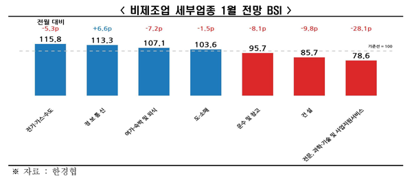 비제조업 세부 업종(총 7개) 중에는 ▸전기·가스·수도(115.8) ▸정보통신(113.3) ▸여가‧숙박 및 외식(107.1) ▸도‧소매 유통(103.6)이 호조 전망을 보였다. 한편, ▸전문, 과학·기술 및 사업지원서비스(78.6) 등 3개 업종은 업황 부진이 전망된다.