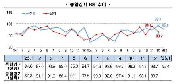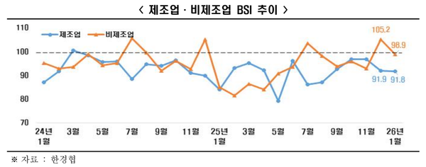 업종별로는 제조업(91.8)과 비제조업(98.9) 모두 부진할 것으로 전망됐다. 제조업 BSI(91.8)는 2024년 4월부터 1년 10개월 연속 기준치를 하회했다. 2025년 12월(105.2) 기준선 100을 넘어섰던 비제조업 BSI는 2026년 1월 98.9로 전망되면서 한 달 만에 기준선 아래로 내려왔다.