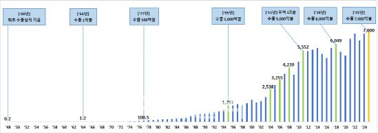 수출 7000억달러는 2018년 6000억달러 달성 이후 7년 만에 이뤄낸 쾌거로 전 세계에서 6번째이다. 6000억달러는 7번째, 7000억달러는 6번째로 우리 수출이 글로벌 주요국 대비 빠르게 성장하고 있음을 증명했다.