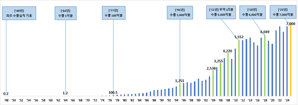 관세청과 산업통상부는 12월 29일 13시 03분 기준으로 잠정 집계한 결과 올해 연간 누계 수출액이 7,000억 달러를 달성했다고 밝혔다.
