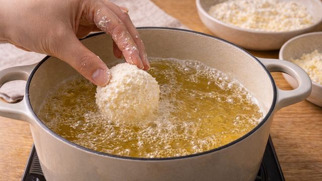 코팅이 완료된 아이스크림을 곧바로 약 200도의 기름 냄비에 넣는다. 순식간에 튀겨내는 것이 중요하기 때문에 10초 이내에 바로 꺼내줘야 한다. 튀김 옷이 갈색으로 변하면 바로 꺼내주는 것이 좋다.