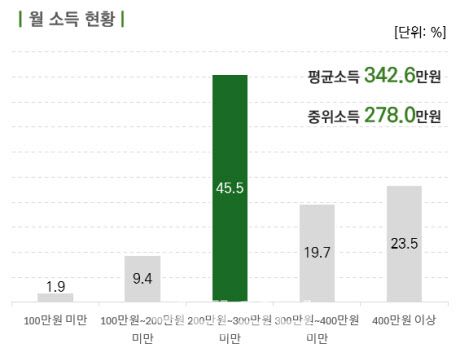 고등교육기관 졸업자의 월 평균소득은 342만 6000원으로 집계됐다. 전문대 졸업자는 월 평균 269만 3000원을, 일반대학 졸업자는 314만 6000원을 받았다. 대학원 석사 졸업자의 월 평균소득은 496만 2000원이었고 대학원 박사 졸업자는 653만 2000원으로 나타났다.