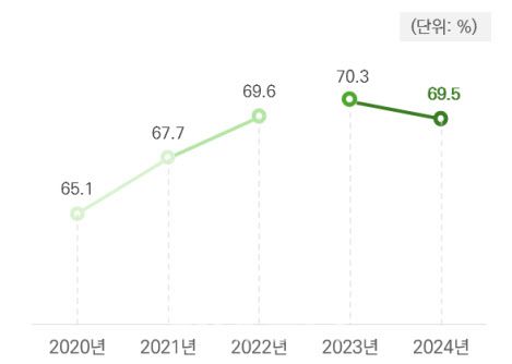 조사 결과 지난해 졸업자는 63만 4904명이며 이 중 취업자는 37만 7120명이다. 취업률은 69.5%로 전년 대비 0.8%포인트 줄었다. 대학·대학원 졸업자의 취업률은 2020년 65.1%를 기록한 이후 2023년 70.3%까지 상승했다. 그러나 지난해 들어 하락전환했다.