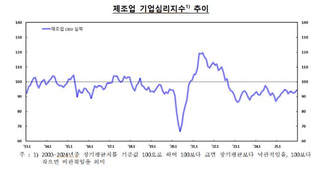 CBSI는 기업경기실사지수(BSI) 중 제조업 5개, 비제조업 4개의 주요 지표 이용해 산출한 심리지표로 장기평균치(2003~2024년)를 기준값(100)삼아 이보다 지수가 크면 기업심리가 낙관적임을, 낮으면 비관적으로 본다. 기업심리지수는 지난 2022년 10월 이래 100선을 하회 중이다.