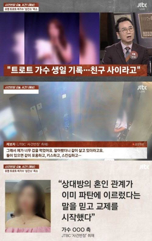 하지만 A씨는 “한 가정을 파탄 내놓고 결국 돈 때문에 봐달라니 너무 괘씸하고 기막히다”며 “유튜브 등에 B씨 행사장에 남편이 동행하는 모습이 올라오고, 결혼식장 다니면서 축가를 다닐때마다 너무 괘씸했다. 더 이상 방송에 나오는 모습을 보고 싶지 않아 제보를 결심했다”고 강조했다.