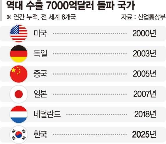 수출액 7000억달러 달성은 전 세계 여섯 번째로, 미국(2000년), 독일(2003년), 중국(2005년), 일본(2007년), 네덜란드(2018년) 다음이다. 2018년 거둔 수출액 6000억달러 달성은 세계 7번째였으나, 이번 7000억달러는 한 단계 올라섰다.