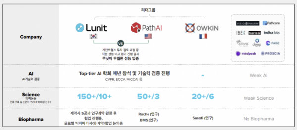 또한 루닛은 PathAI와의 기술력 비교에서 우위를 점했다. 루닛이 발표한 관련 사이언스 논문은 150건 이상인 반면 PathAI는 약 10여건 수준으로 전해진다. 특히 높은 영향도 논문(SCI IF 10 이상)에서 루닛은 10건 이상, PathAI는 5건 수준으로 알려졌다.