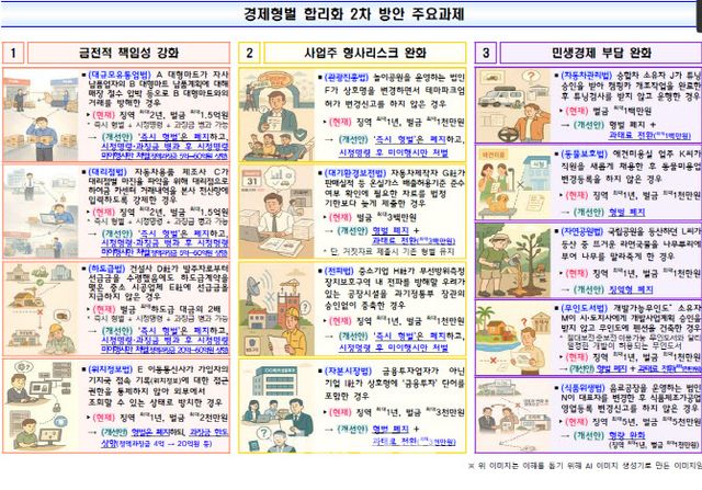 사업주 형사리스크는 완화한다. 사업주의 고의가 아니거나 단순 행정상 의무 위반 등에 대해선 형벌을 완화하거나 과태료로 전환하도록 해 기업활동을 지원한다. 예를 들어 자본시장법상 관련 없는 자가 상호에 금융투자, 증권, 신용보증기금 등 유사 명칭을 사용할 경우 징역 1년에 처할 수 있지만, 과태료 3000만원이 부과되도록 한다. 비료관리법상 비료 성분·효과·제조방법 등에 대해 과대 광고한 경우 징역 2년과 벌금 2000만원에 처할 수 있지만, 징역형을 폐지한다.