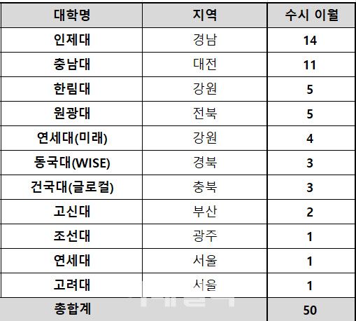 실제로 지방 소재 의대에서는 48명의 미충원이 발생했다. 서울 소재 의대는 2명에 그쳤다. 대학별 수시 미충원 인원은 △인제대 14명 △충남대 11명 △한림대 5명 △원광대 5명 △연세대(미래) 4명 △동국대(WISE) 3명 △건국대(글로컬) 3명 △고신대 2명 △조선대·연세대·고려대 각 1명이다.