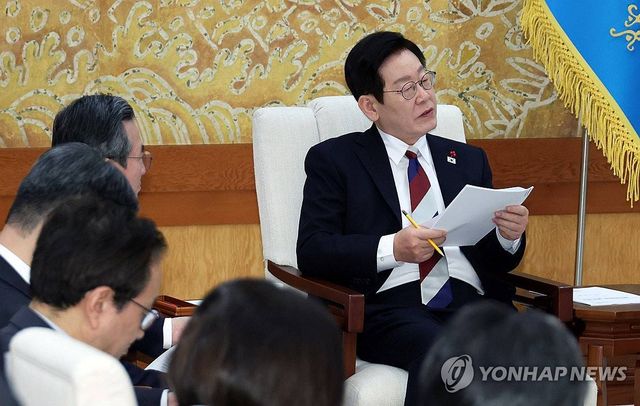 이재명 대통령이 청와대로 첫 출근한 지난 29일 참모진과 차담을 하고 있다 / 연합뉴스