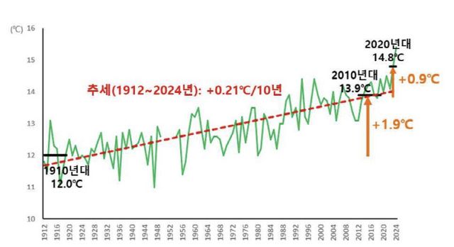 보고서에 따르면 지난 113년간 우리나라 연평균 기온은 꾸준히 올랐다. 1910년대 12도였던 연평균기온은 100년이 지난 뒤인 2010년대에 13.9도로 1.9도 상승했다. 이 기온은 2020년대에 급격히 뛰어 14.8도를 기록했다. 단기간에 0.9도가 오른 것이다. 113년간 연평균 기온이 가장 높은 해 10위 안에도 최근 10년 중 지난해와 2023년, 2021년 등 7개 해가 포함됐다.