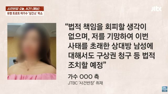 29일 JTBC ‘사건반장’ 측은 트로트 가수 A 씨와 자신의 남편이 외도해 가정이 파탄났다는 주부 B 씨의 제보를 보도했다.