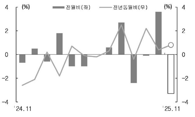 소매판매는 지난 8월(-2.4%)과 9월(-0.1%) 연속 하락하다 긴 추석 명절과 소비쿠폰 등 정책 효과로 10월(3.6%) 반등한 바 있다.