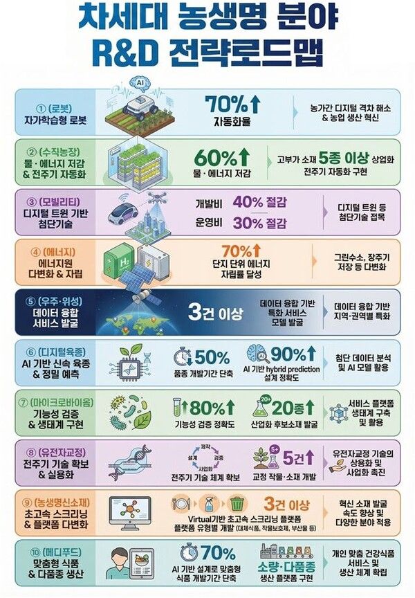 농식품부는 로봇, 수직농장, 모빌리티, 에너지, 우주·위성 등 첨단 산업 분야와 디지털육종, 마이크로바이옴, 유전자교정, 농생명 신소재, 메디푸드 등 첨단 기술 분야를 10대 전략기술로 선정했다.