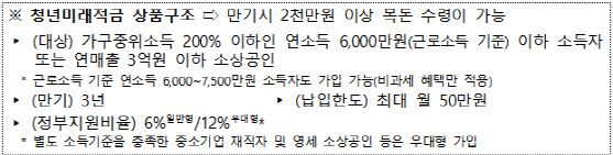 또 6월 중 청년이 저축한 금액에 정부 기여금이 지급되는 비과세 적금 상품인 ‘청년미래적금’도 출시된다. 가구 중위소득 200% 이하인 연소득 6000만원(근로소득 기준) 이하 소득자 또는 연매출 3억원 이하 소상공인이 대상이다. 만기는 3년으로 만기 수령시 2000만원 이상의 목돈을 마련할 수 있다.