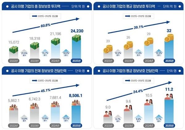뉴시스 보도에 따르면, 30일 과학기술정보통신부가 발표한 '2025년 정보보호 공시 현황 분석보고서'에 따르면 정보보호 투자액과 정보보호 전담인력 증가율은 각각 14.3%, 10.7%다.