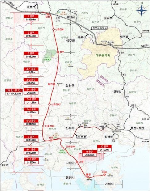 해당 노선은 설계속도 시속 250㎞의 고속철도로, 전 구간 개통 시 서울~거제 이동 시간이 약 2시간30분대로 단축돼 남부권 철도 교통망 확충과 지역 균형발전에 기여할 것으로 기대된다.