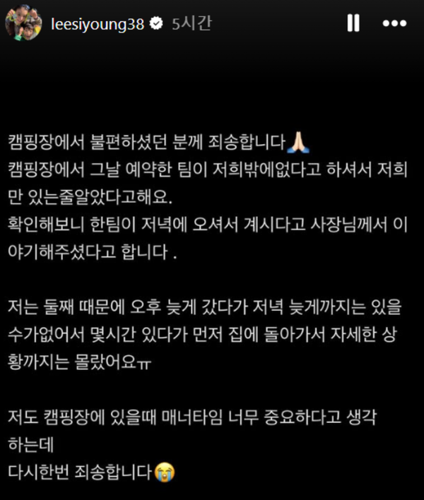 최근 온라인 캠핑 커뮤니티에는 지난 22일 양평의 한 캠핑장을 방문했다가 이시영과 동행한 크루들로 인해 큰 불편을 겪었다는 폭로 글이 게시됐다. 작성자 A씨는 당시 현장 상황에 대해 젊은 이용객들이 상의를 탈의한 채 돌아다니고 마이크를 이용해 단체 게임을 진행하는 등 마치 대학생 MT촌을 방불케 했다고 전했다. 특히 스피커에서 흘러나오는 소음과 정답을 맞히는 비명 소리가 텐트 내부까지 생생하게 들려 5세 아이와 함께 온 가족이 극심한 스트레스를 받았다고 토로했다.