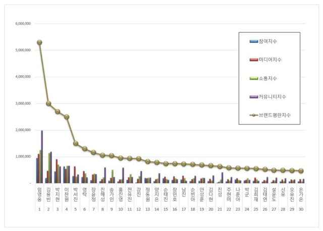 대망의 1위 임영웅 브랜드는 참여지수 95만 1919, 미디어지수 110만 1015, 소통지수 125만 1216, 커뮤니티지수 198만 8102가 되면서 브랜드평판지수 529만 2253으로 분석됐다. 지난 11월 브랜드평판지수 704만 5995와 비교해보면 24.89% 하락했다.