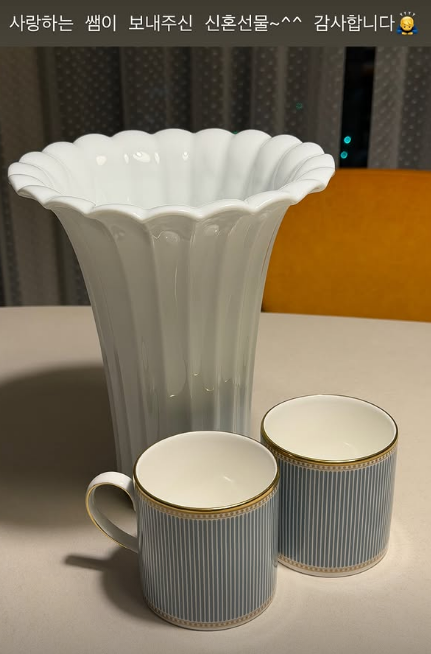 공개된 사진 속엔 길쭉한 꽃 형태의 우아한 화분과 금테가 둘러진 파란 스트라이프 커플 머그컵 한 쌍이 테이블 위에 놓여져있다. 온주완과 방민아의 신혼집으로 추정되는 이 공간 뒤로는 도트 무늬 레이스 소재 커튼이 함께 담겨 아기자기한 분위기를 엿보이게 한다.