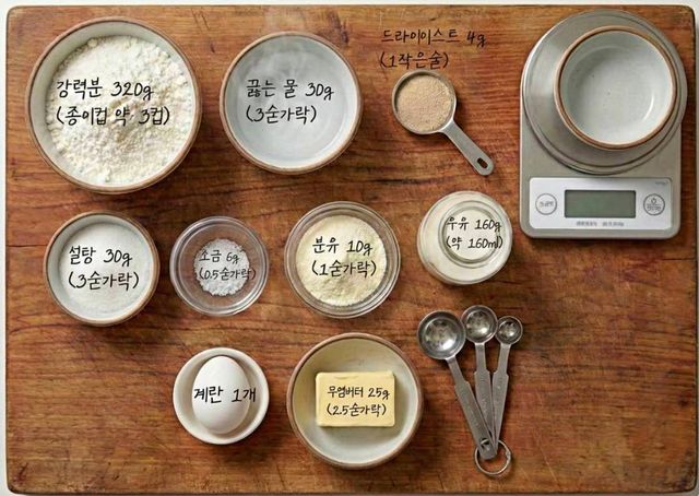 본 반죽은 강력분 300g, 드라이이스트 4g, 설탕 30g, 소금 6g, 분유 10g(생략 가능), 미지근한 우유 160ml, 실온 계란 1개, 무염버터 25g으로 구성된다. 반죽을 시작할 때는 큰 볼에 밀가루를 담고 구멍을 세 개 파 이스트, 설탕, 소금을 각각 분리해 넣는 것이 좋다. 소금이 이스트에 직접 닿으면 발효력이 떨어질 수 있기 때문이다.
