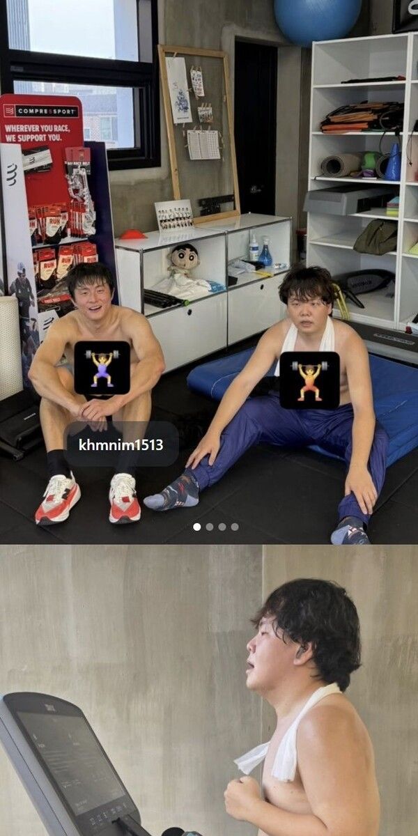 공개된 사진 속 곽튜브는 웹툰작가 겸 방송인 기안84와 체육관 바닥에 앉아서 쉬고 있다.