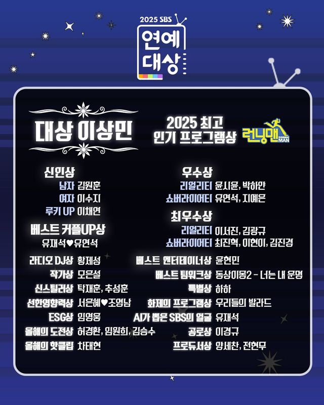 이번 시상식은 배우들이 더 이상 예능의 ‘스페셜 게스트’가 아닌, 핵심 주역으로 완전히 자리 잡았음을 보여준 자리이기도 했다. 특히 〈틈만 나면,〉에서 유재석과 안정적인 호흡을 보여준 유연석은 쇼·버라이어티 부문 남자 우수상에 이어 베스트 커플UP상까지 거머쥐며 존재감을 확실히 각인시켰다.