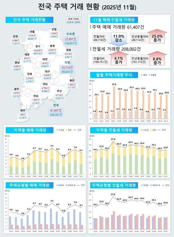 뉴시스 보도에 따르면, 31일 국토교통부 2025년 11월 주택통계에 따르면, 지난달 전국 주택 매매거래량은 6만1407건으로 전월(6만9718건) 대비 11.9% 줄었다. 전년동기(4만9114건)와 비교하면 25.0% 증가했다.