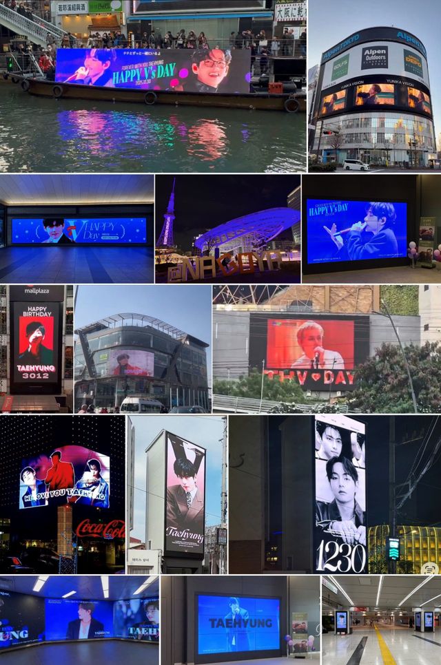 일본 팬베이스 ‘태태유니버스’는 일본 최초로 하네다 공항에서 뷔 생일 광고를 진행했다. 하네다 공항 에어포트 가든에 설치된 30m 대형 LED 광고판을 비롯해 18개의 세로형 LED 광고, 대형 사이니지에는 생일 축하 영상이 상영되며 공항 이용객들의 시선을 사로잡았다. 도쿄, 삿포르, 아키타, 나고야, 오사카, 히로시마, 에히메, 후쿠오카, 오키나와 등 9개 도시의 대형 LED 비전에서도 생일 축하 영상이 송출됐다. 시부야 아이비전 광고는 24시간 유튜브를 통해서도 공개됐다.