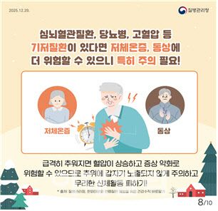 임승관 질병관리청장은 “음주 시 추위를 잘 느끼지 못해 한랭질환 위험이 높아지는 만큼 연말연시에는 절주와 함께 보온에 각별히 유의해 주시기를 바란다”고 강조했다.