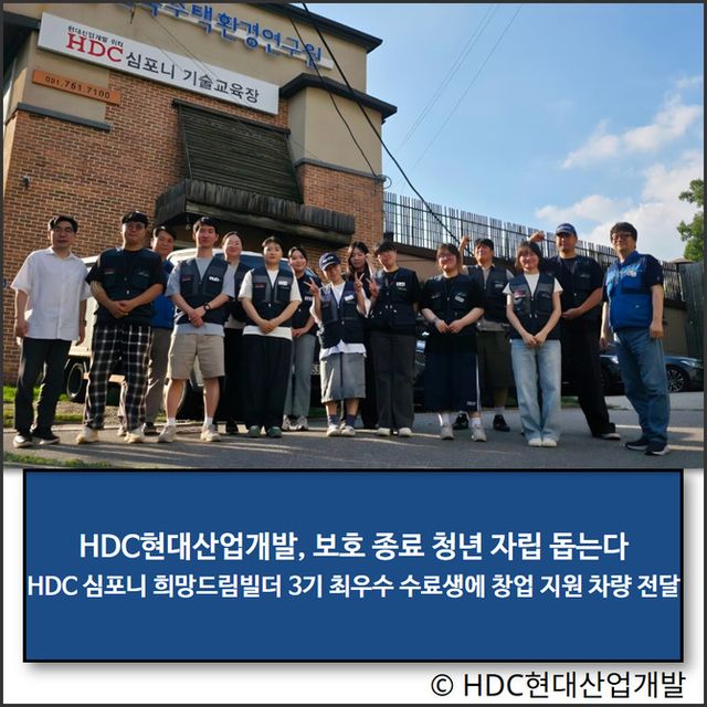 HDC현대산업개발이 지난 30일 경기도 성남시 수정구에 있는 한국주택환경연구원에서 HDC 심포니 희망드림빌더 3기 최우수 수료생에 대한 창업 지원 차량 수여식을 개최했다. 김영중 집으로가는길 대표, 이정현 한국주택환경연구원 대표, 이동훈 HDC현대산업개발 홍보팀장 등이 참석했다.