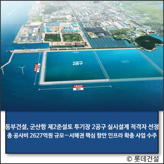 동부건설은 해양수산부 군산지방해양수산청이 턴키 방식(설계·시공 일괄입찰)으로 발주한 '군산항 제2준설토투기장(2공구) 축조공사'의 실시설계 적격자로 선정됐다고 31일 밝혔다.
