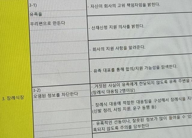 매뉴얼에는 일명 ‘미션’이 존재했다. 사건 발생, 병원 대응, 장례식장, 고용노동부 대응, 국회 대응, 경찰 대응 등 일곱 단계로 구성됐다. 특히 장례식장 단계에선 “유족을 우리 편으로 만든다” “오염된 정보를 차단한다” 등 두 가지가 미션으로 언급됐다.