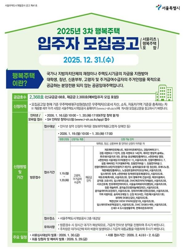 서울주택도시개발공사(SH)가 행복주택 2368세대를 공급한다.