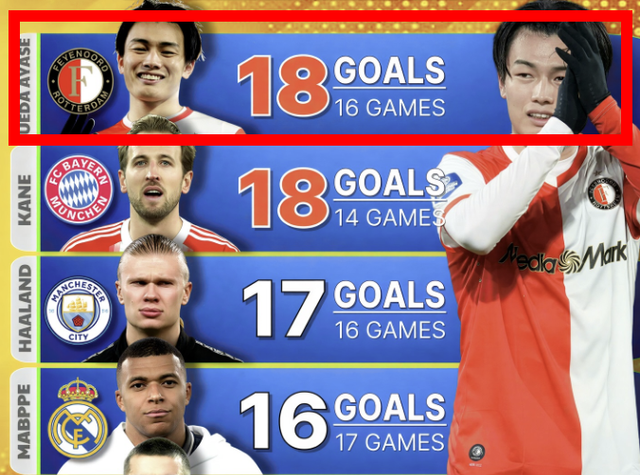 우에다는 얼마 전 또 다른 축구 콘텐츠 매체 '스코어90'에선 이번 시즌 전반기 유럽 6대리그 공격수에서 케인과 함께 18골을 넣어 공동 1위에 오르기도 했다.