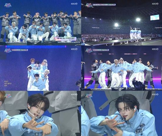 경쾌한 기타 리프로 시작된 미니 4집 타이틀곡 ‘OVERDRIVE’ 무대는 TWS만의 사랑스러움이 돋보였다. ‘앙탈 춤’ 구간에서는 손가락을 살짝 깨물고 어깨를 흔드는 동작과 표정 연기로 관객들을 열광시켰다.