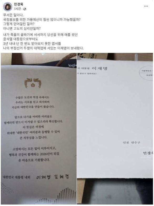 뉴시스 보도에 따르면, 민 전 의원은 31일 자신의 페이스북에 이 대통령이 보낸 연하장 사진을 올리며 "무서운 일"이라고 적었다.