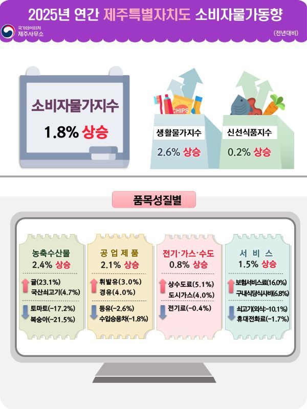 국가데이터처 제주사무소가 지난달 31일 발표한 '2025년 12월 및 연간 제주특별자치도 소비자물가동향'에 따르면 지난해 연간 소비자물가지수는 116.0(2020년=100)으로 전년 대비 1.8% 상승했다. 이는 2024년과 동일한 상승률이며, 전국(2.1%)보다는 낮은 수준이다. 2022년 5.9%까지 치솟았던 제주 소비자물가 상승률은 2023년 3.0%, 2024년 1.8%로 낮아졌다.