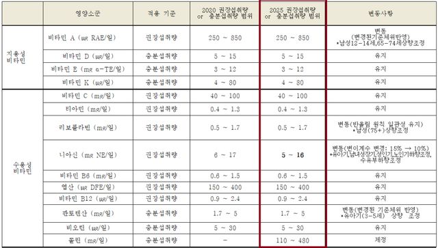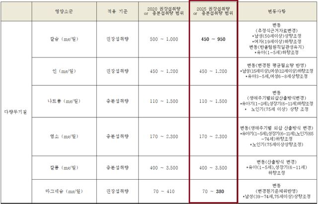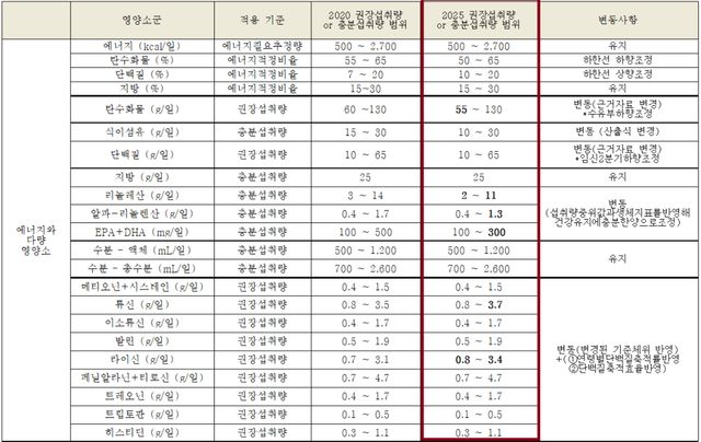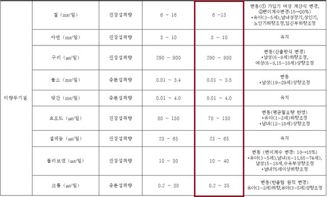 이밖에 식이섬유, 비타민 B6, 칼슘, 인, 나트륨 등 20개 영양소의 적정 섭취기준이 변경됐다.