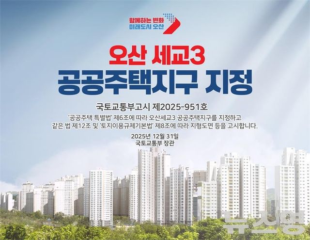 오산시는 31일 국토교통부가 오산 세교3 공공주택지구(이하 오산세교3신도시)의 지구지정 고시를 완료했다고 밝혔다.