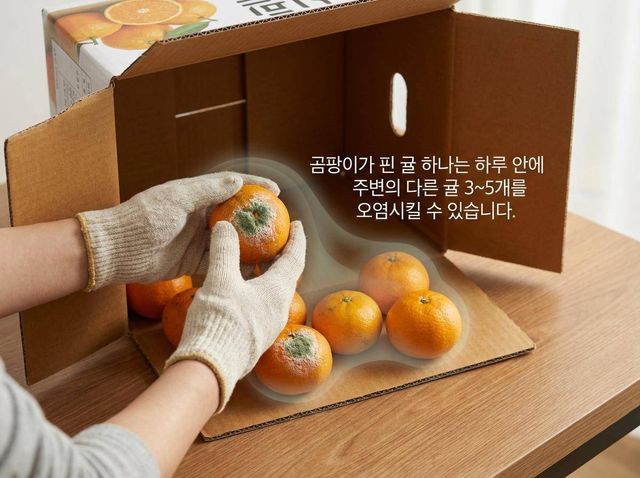아무리 신경 써도 곰팡이는 예고 없이 나타날 수 있다. 곰팡이가 핀 귤은 발견 즉시 제거해야 한다. 상자 바닥이나 벽면까지 번졌다면 상자 자체를 교체하는 것이 안전하다. 주변 귤은 겉보기에는 멀쩡해 보여도 곰팡이 포자가 묻어 있을 가능성이 있다. 흐르는 물에 씻어 바로 먹거나, 70~80% 농도의 주방용 알코올을 천에 묻혀 껍질을 닦은 뒤 우선 소비하는 방식이 도움이 된다.