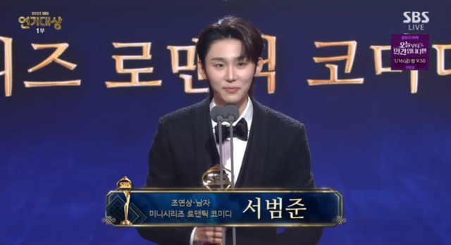 서범준은 수상 소감으로 “시상을 하러 왔다가 ‘우주메리미’ 식구들을 보러 왔는데, 지난해 신인상을 받고 또 언제 이 자리에 설 수 있을까 생각했었다”며 “다시 이 무대에 설 수 있게 해주신 제작사와 우주메리미 배우들, 스태프분들께 감사드린다”고 말했다.