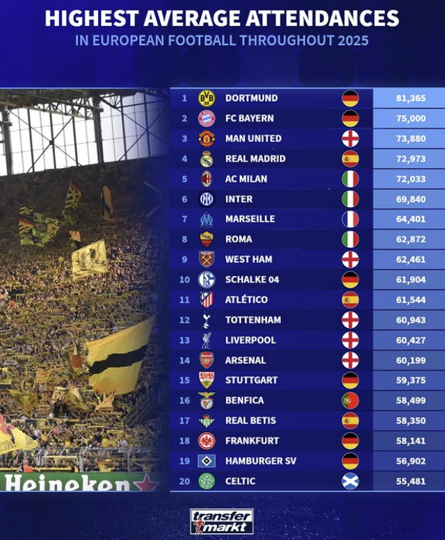 글로벌 축구 전문 매체 '트란스퍼마르크트'는 2025년 한 해 유럽 구단들의 평균 홈 경기 관중수 순위를 공개했다. 독일 분데스리가 등 유럽의 빅클럽들이 대거 이름을 올린 가운데, 독일 2부 구단이 톱10에 진입한 것이다.