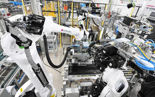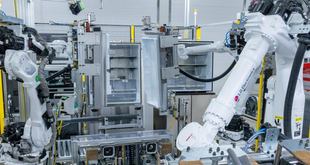 경남 창원 LG스마트파크 냉장고 조립라인에서 로봇이 자동화 공정을 수행하고 있다.(사진=LG전자)