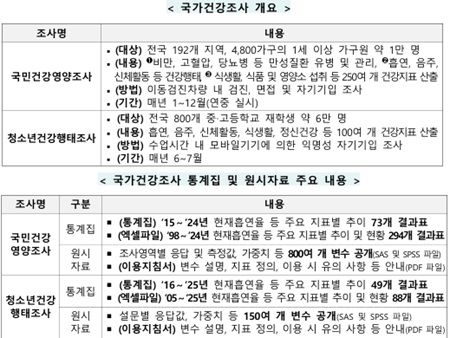 질병관리청이 12월 31일부터 2024년 국민건강영양조사와 2025년 청소년건강행태조사의 통계집 및 원시자료, 원시자료 이용지침서를 질병관리청 누리집을 통해 공개한다.